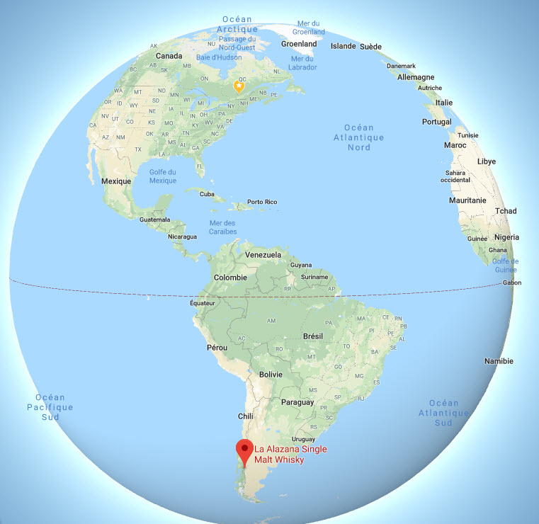En ligne droite on parle de 9700 km. Vous voulez aller visite la distillerie ? Il y un vol direct de Air Canada de 14 heures au départ de Toronto pour Buenos Aires. Et prévoyez ensuite 19 heures de voiture pour vous rendre à la distillerie.