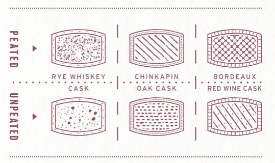 Deux spiritueux – un tourbé et un non tourbé – sont vieillis séparément chacun dans 3 types de fûts: