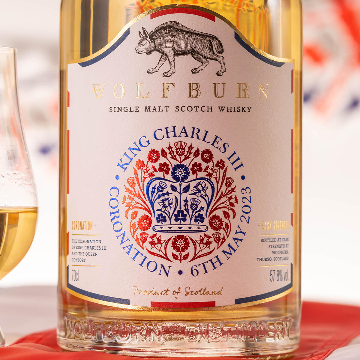 Description (en anglais) du site web de Wolfburn : To celebrate the historical occasion of the Coronation of His Majesty King Charles III we have crafted a special release, based on the flavour profile most enjoyed by His Royal Highness during his visit to Wolfburn Distillery.Crafted from unpeated spirit matured for a little over seven years in first-fill bourbon barrels, this whisky shows off the best of Wolfburn’s signature soft, sweet spirit, with a remarkable depth of flavour, being bottled at an undiminished 57.8%. Consisting of just 600 bottles in total, this is truly a dram fit for a king.TASTING NOTES